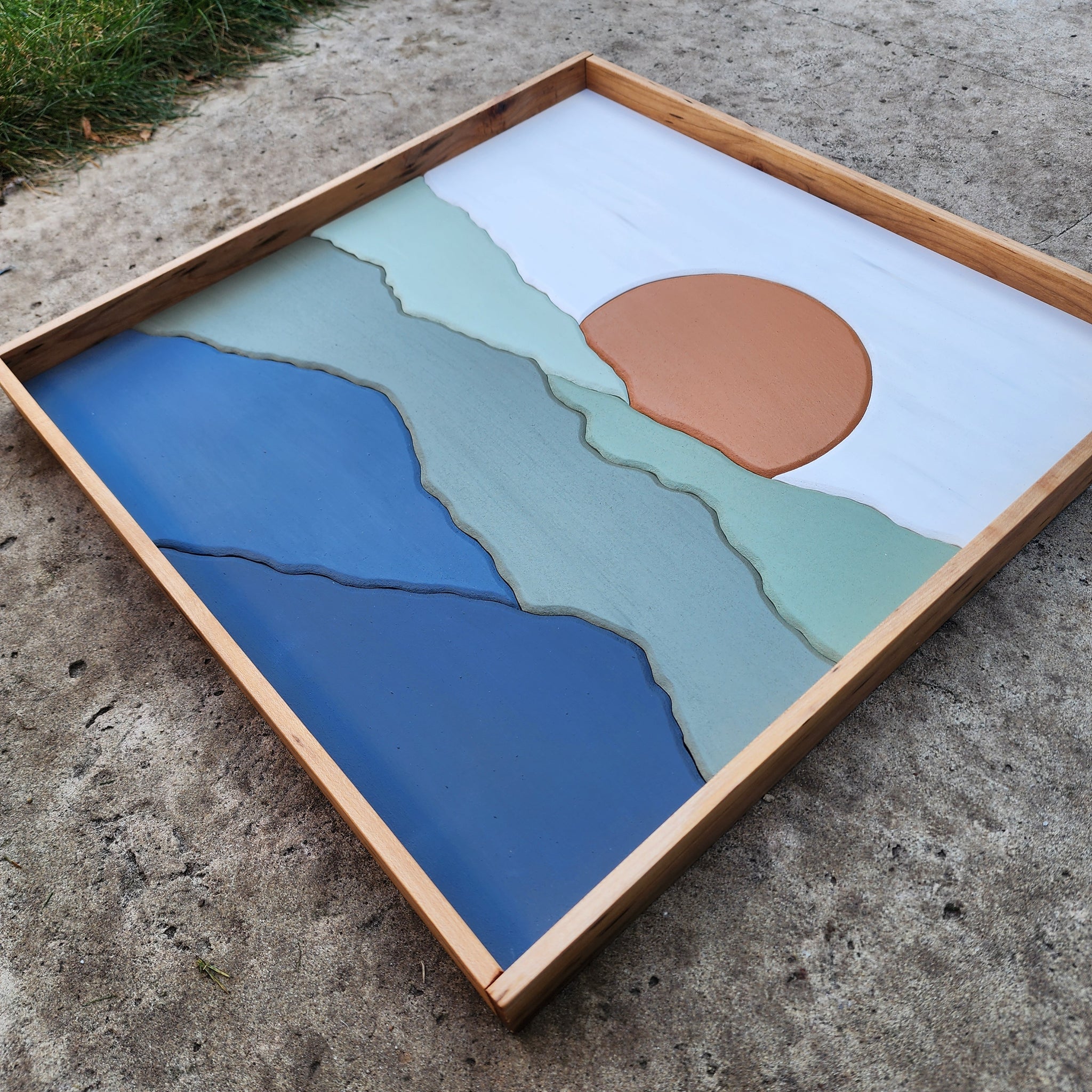 'Reagan' features a beautiful blue and green mountain landscape design with a big sun and light colored frame with lots of character.