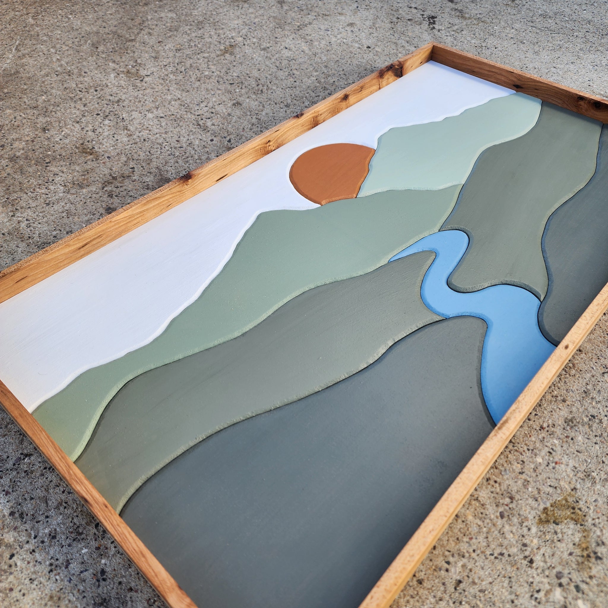 'Rowe' features a beautiful mountain landscape design and a maple frame.